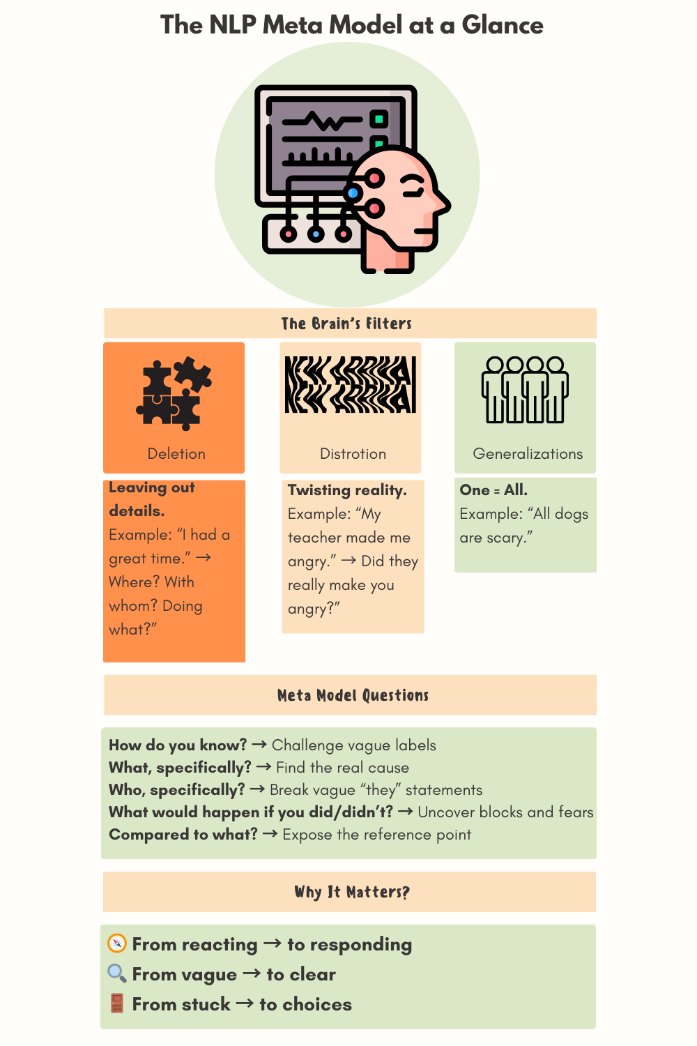 This is where the NLP (Neuro-Linguistic Programming) Meta Model comes in. Think of it as a special toolkit for asking questions that make your mental map sharper, clearer, and far more useful.